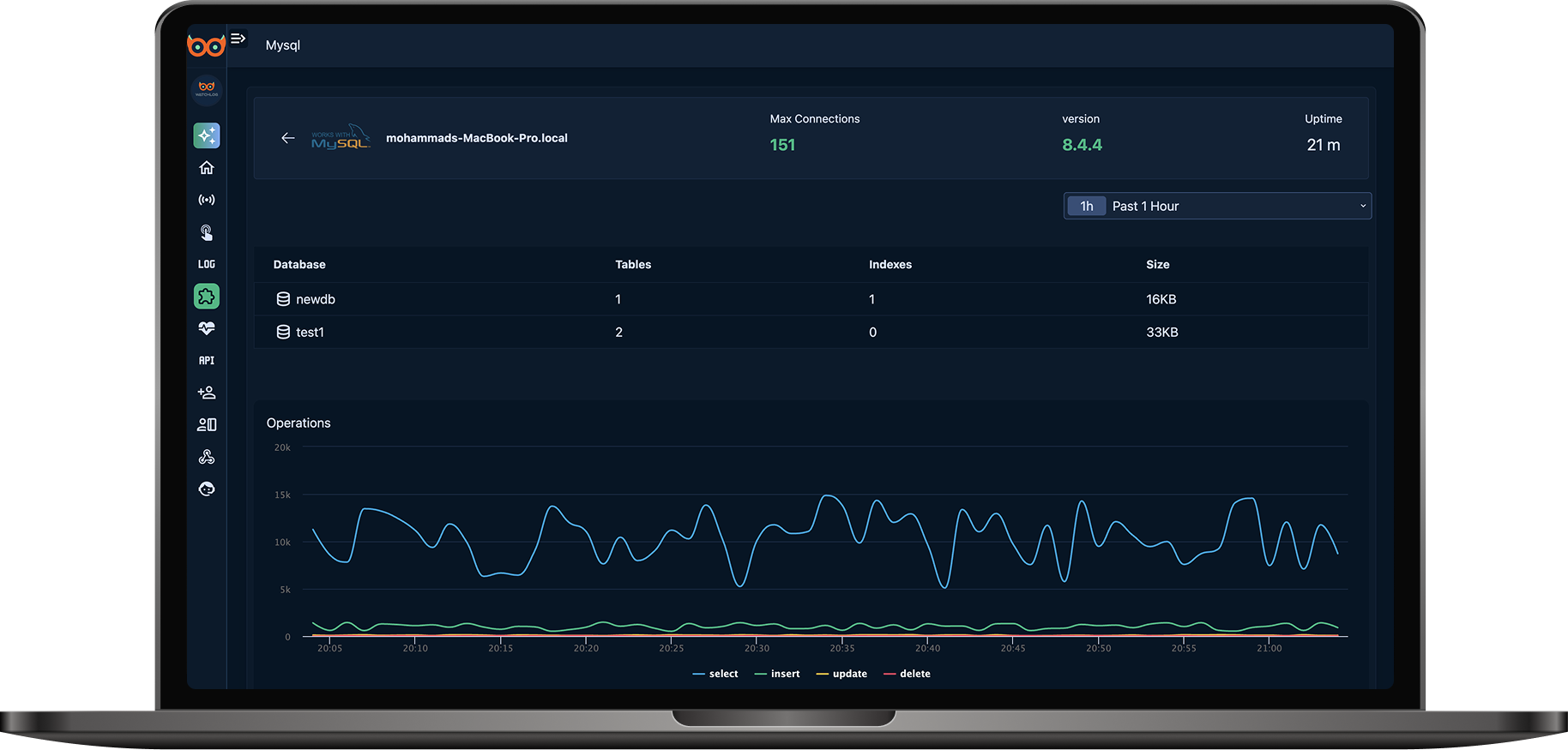Real-time charts for SELECT, INSERT, UPDATE, DELETE operations over time.